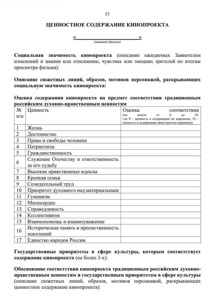 «Фонд кино» официально превратился в министерство пропаганды. Вышла новая методичка для режиссеров: хочешь получить бюджетные деньги - изволь впихнуть в сюжет 17 «духовно-нравственных принципов». Патриотизм, коллективизм и «положительные эмоции» теперь обязательны по ГОСТу.