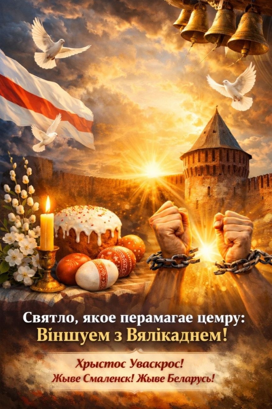 Рэдакцыя радыё «Свабодны Смаленск» шчыра віншуе кожнага, хто чуе наш голас і чытае нашы радкі. Няхай святло вялікдня напоўніць вашыя дамы цяплом, а сэрцы - мужнасцю. Няхай гэты дзень дасць нам усім сілы верыць у немагчымае і набліжаць той час, калі мы зможам адзначыць свята волі на вуліцах нашага вольнага горада.
