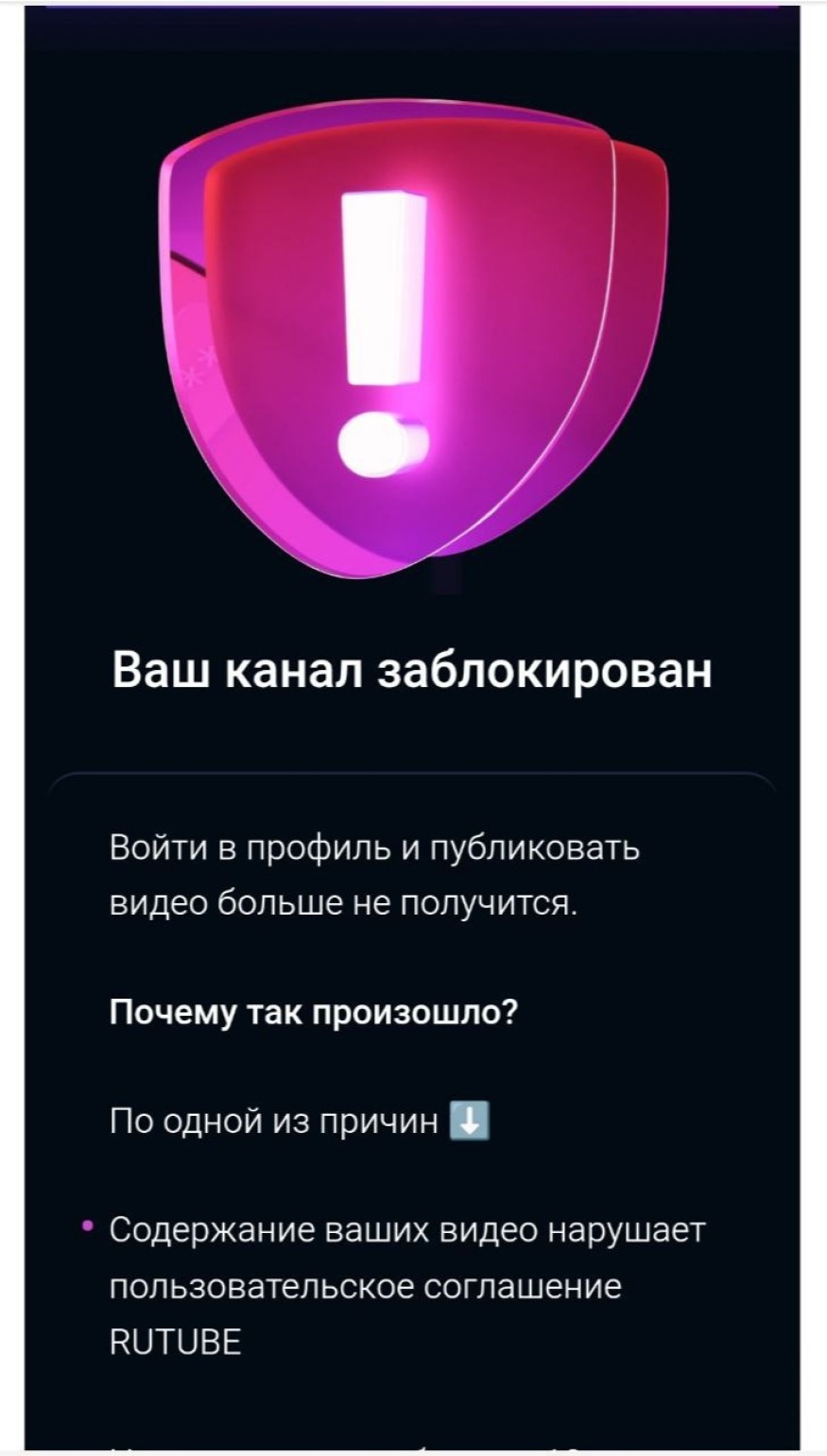 В сообщении говорится, что канал заблокирован, а доступ к профилю и публикации новых видео больше невозможен. В качестве причины указано, что содержание размещённых материалов якобы нарушает пользовательское соглашение Rutube.